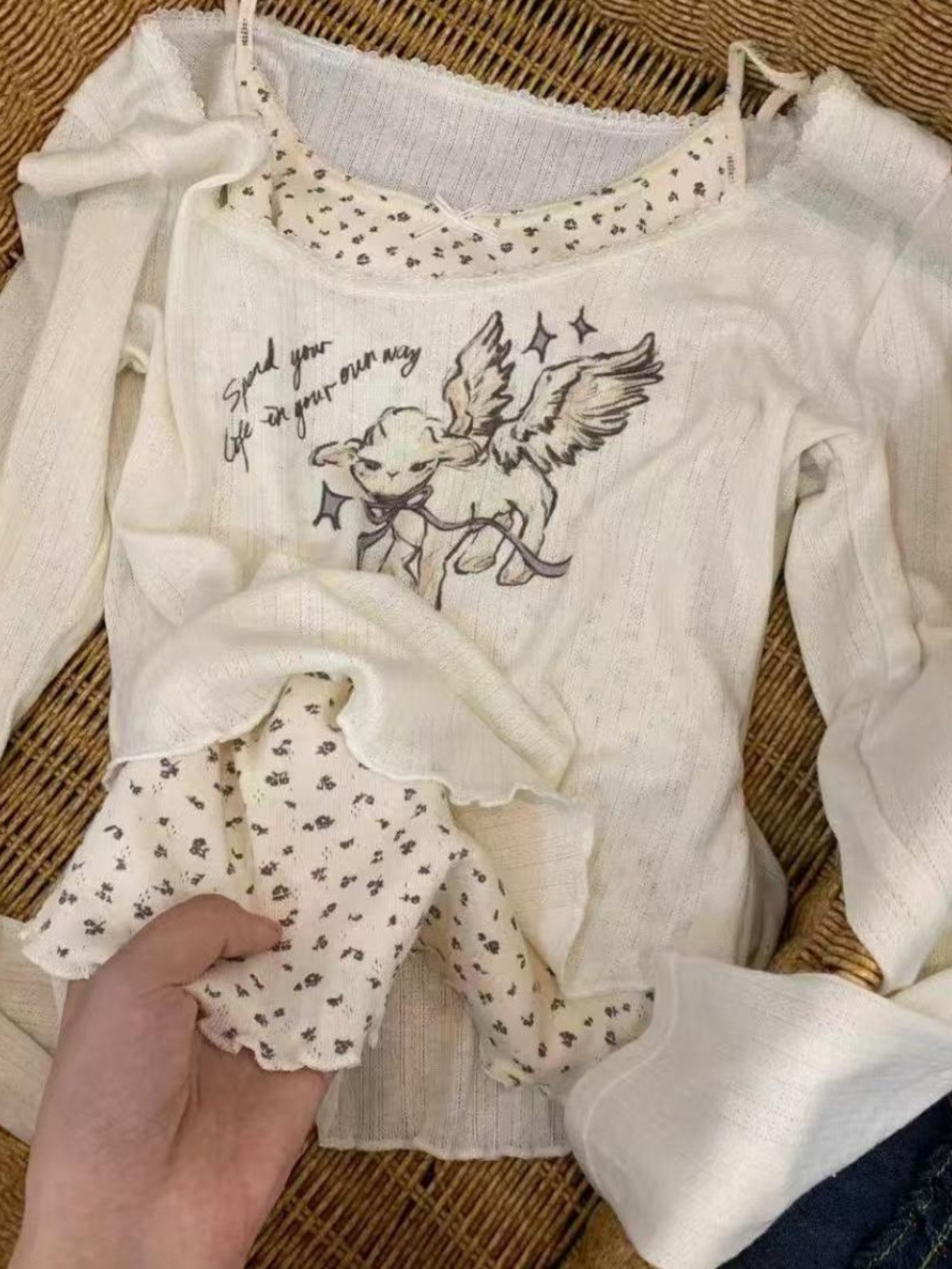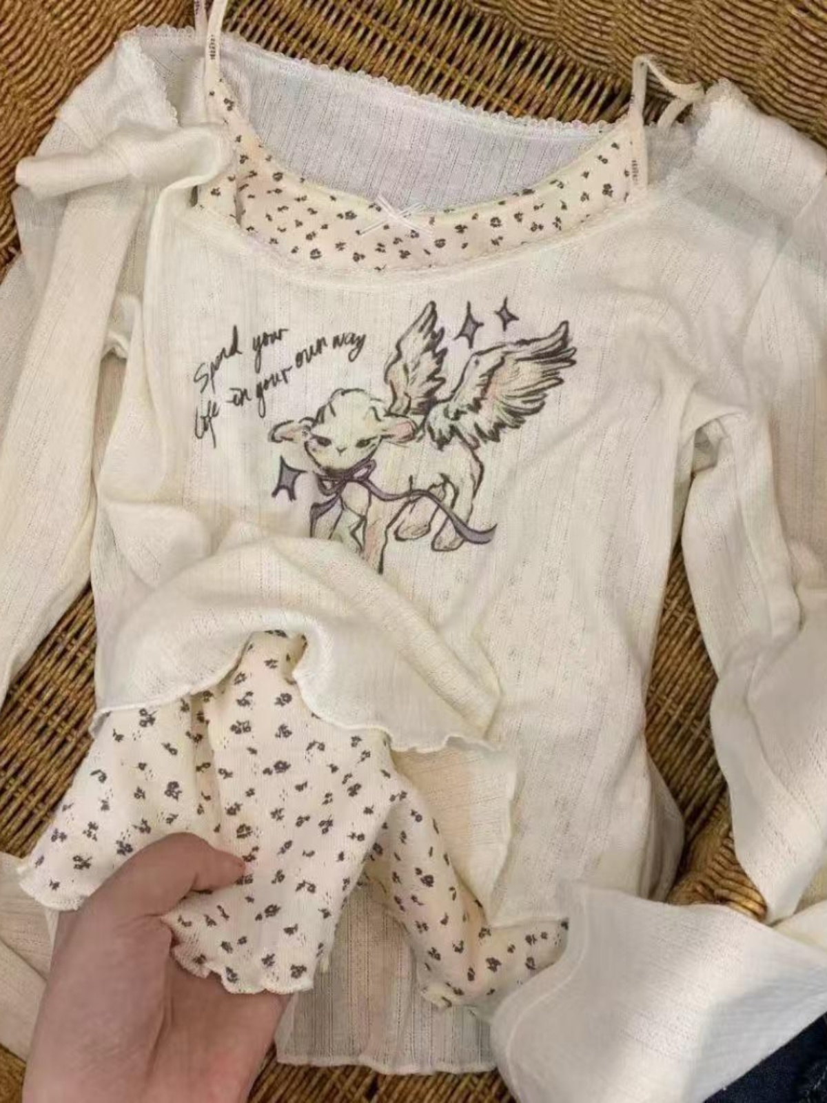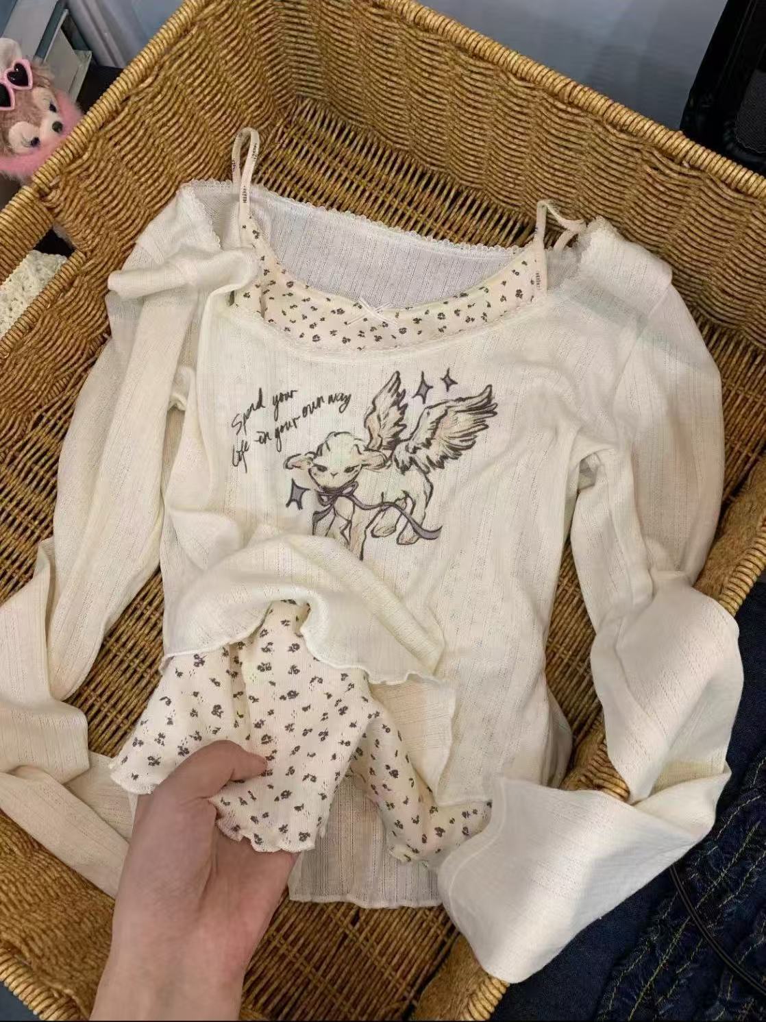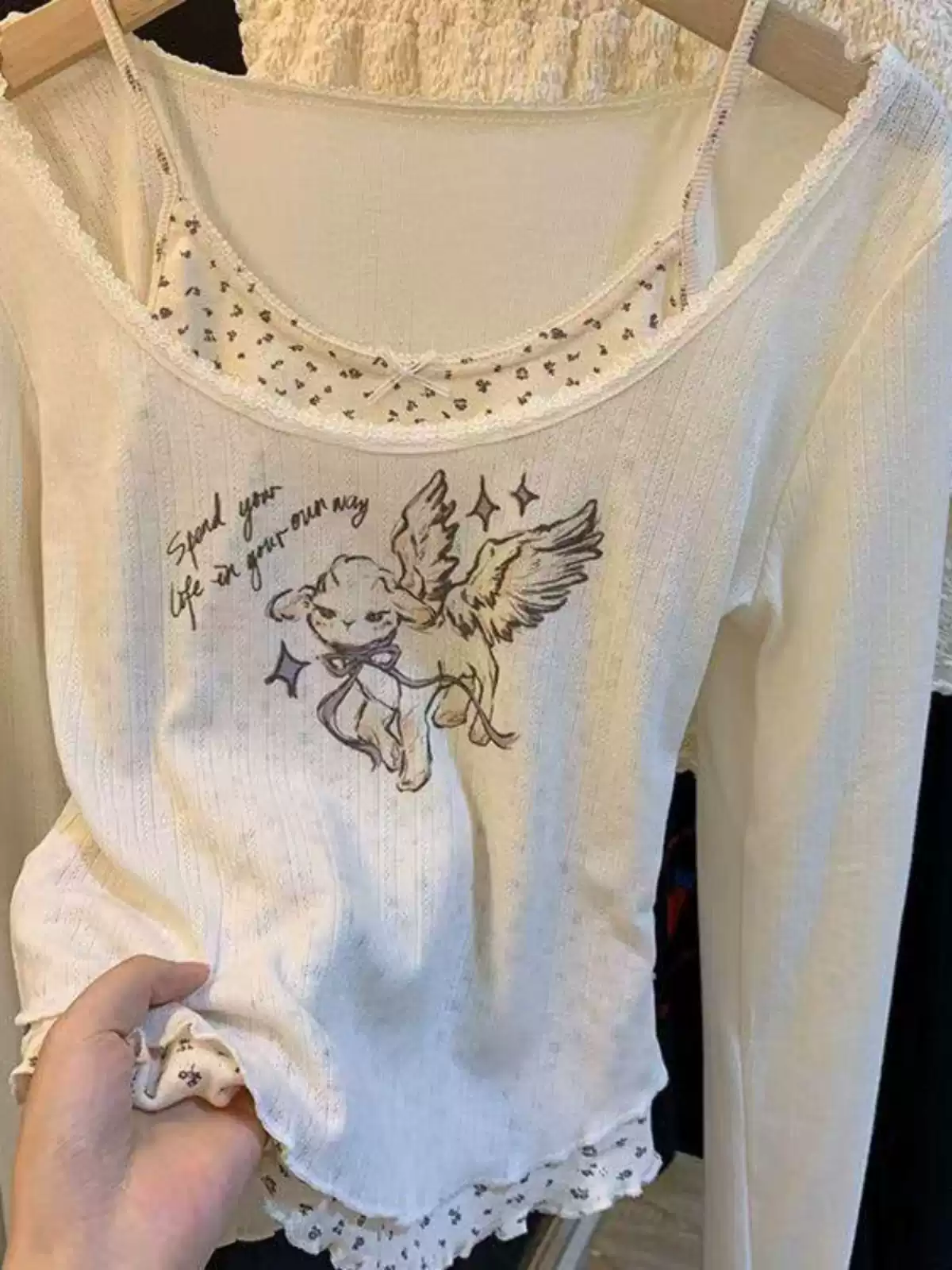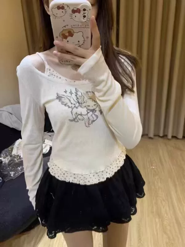 Korean-style long-sleeved T-shirt for women with lace trim.